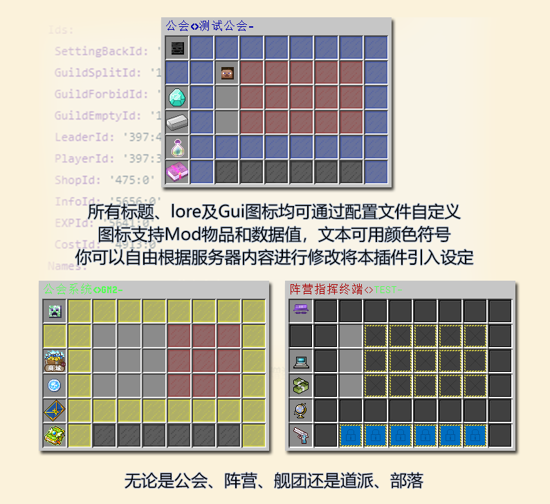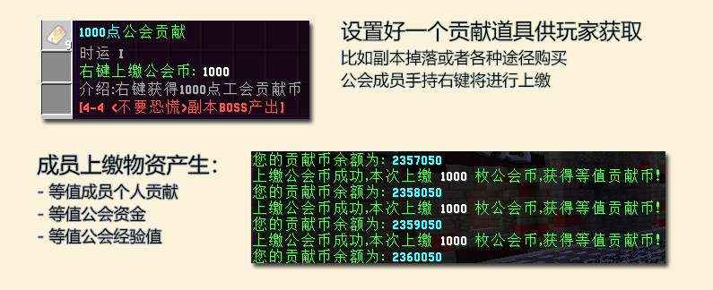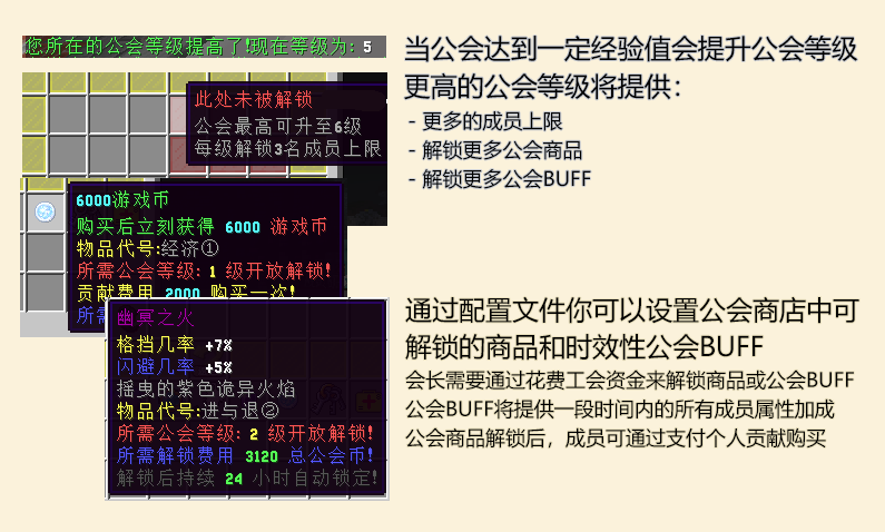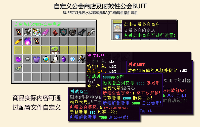 - 高度自定义、自定义你能看到的所有文字内容 - GUI管理、方便管理自己公会的成员 - 属性购买、为你的成员购买属性的加成,真正的属性,攻击,生命等! - 公会商店、让你的成员积极的参与贡献公会购买物品 - 增益时间、每个属性的购买后持续的时间,让公会资金永远有用 |