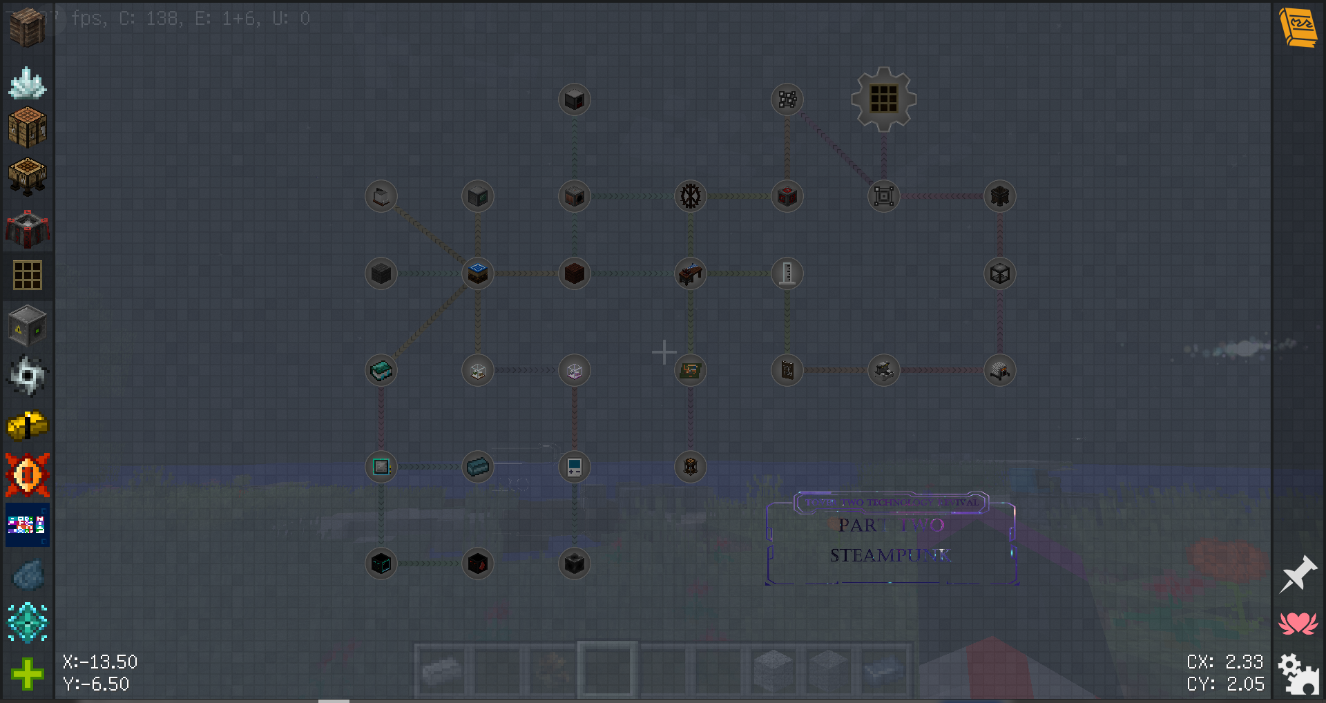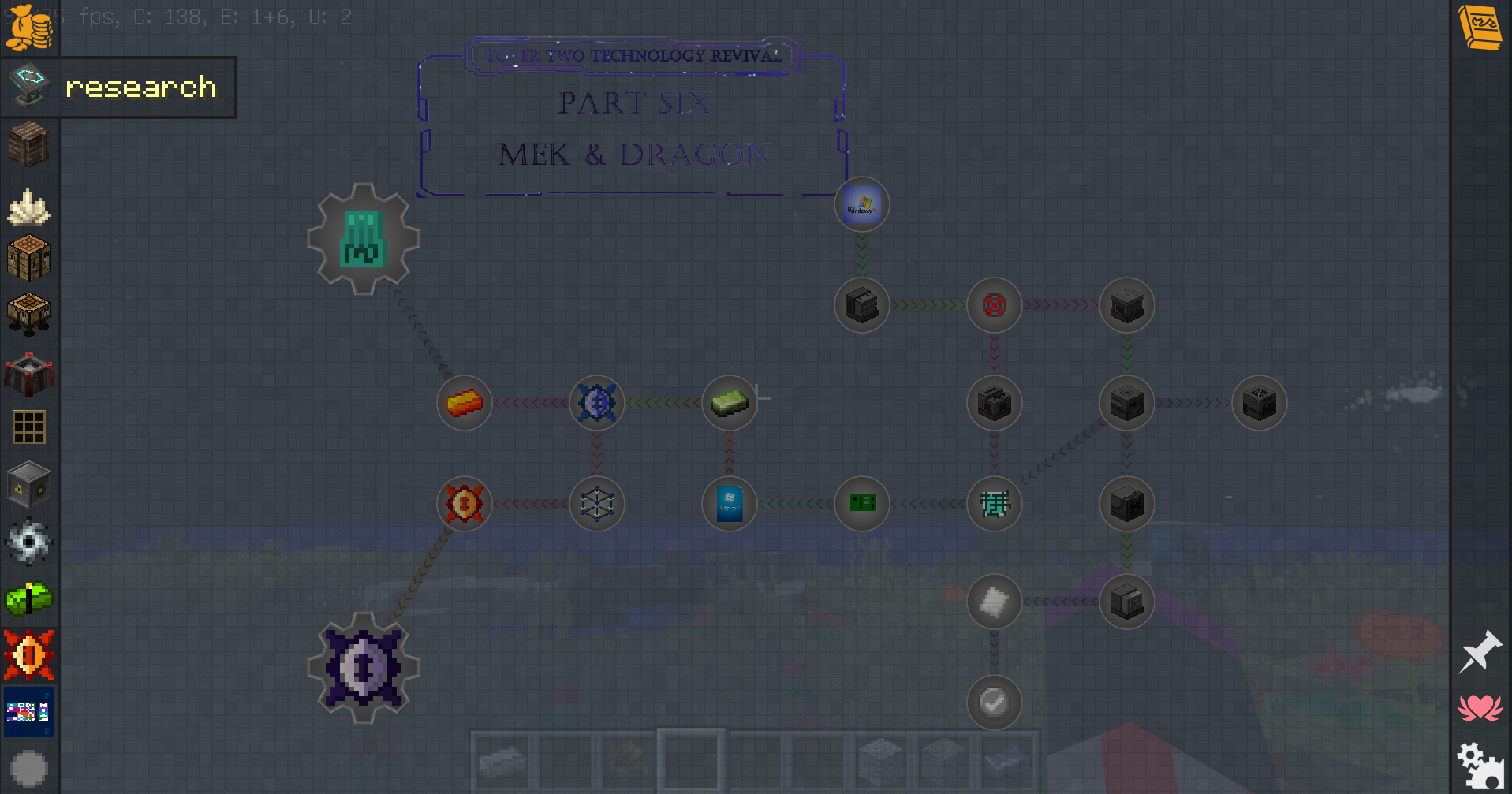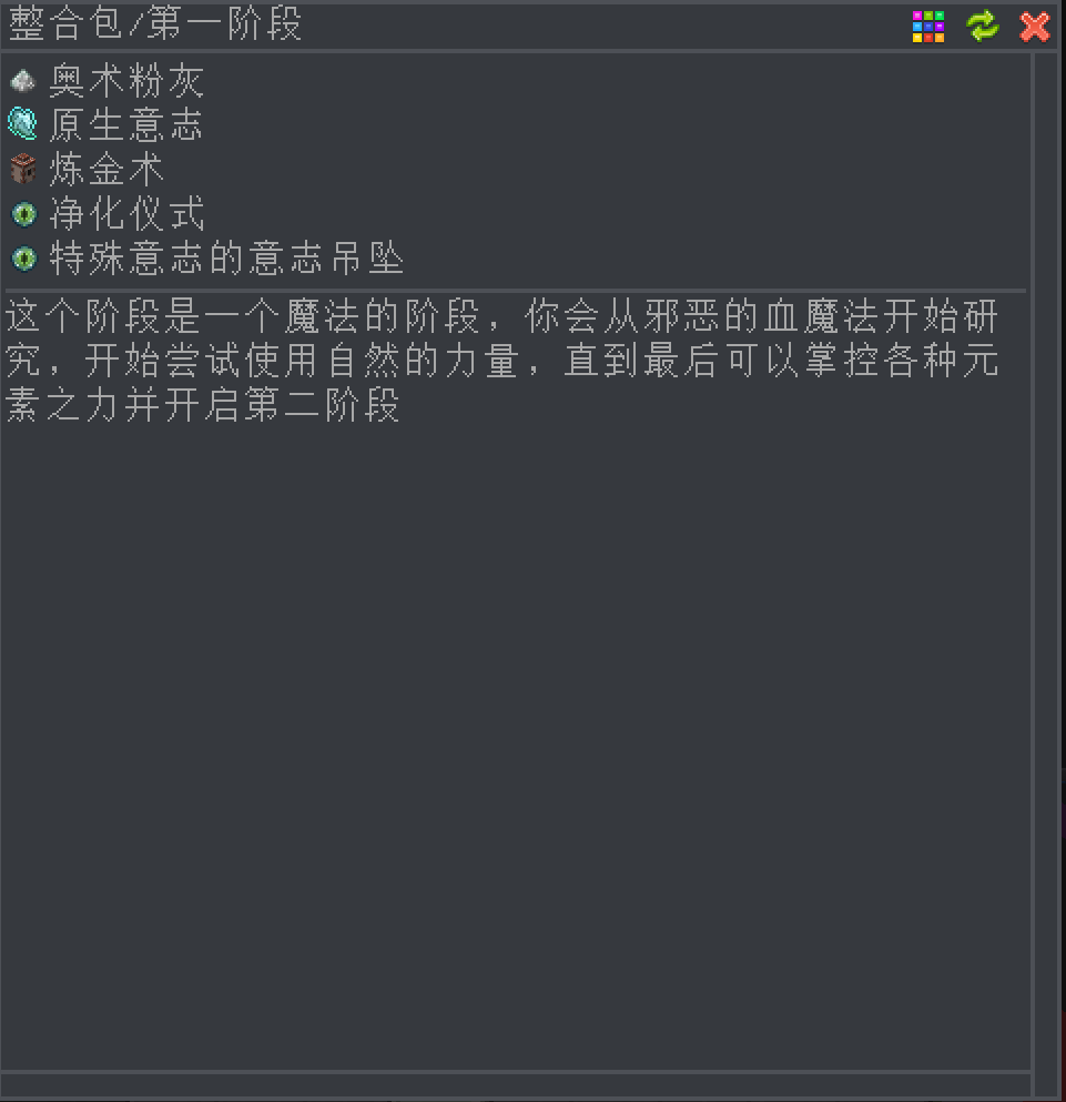 )为提尔系列的第二作,是主世界的生存整合包。不同于一代的空岛,没有为了数量而增加的任务(唯一主线,简洁明了),没有等价交换加速火把等咸鱼mod,更没有靠脸就能乱跳进度的任务随机奖励,但你依然能靠着不用消耗任何物品的加速魔杖,贴心的解答部分问题的指南,以及友善的福利小商店,走上愉快的科魔之路(雾)。